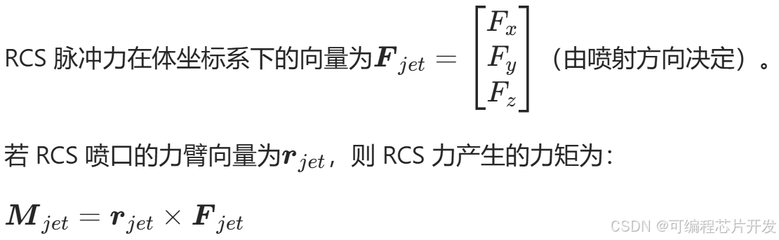 RCS通过喷射工质产生脉冲力,作用于刚体表面,需转换为体坐标系下的力,并计算其对质心的力矩。