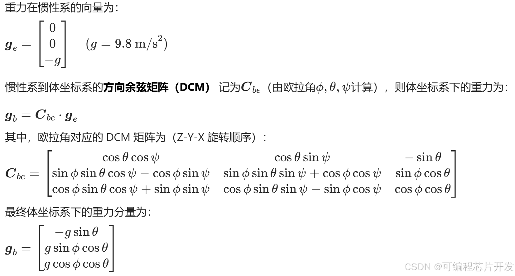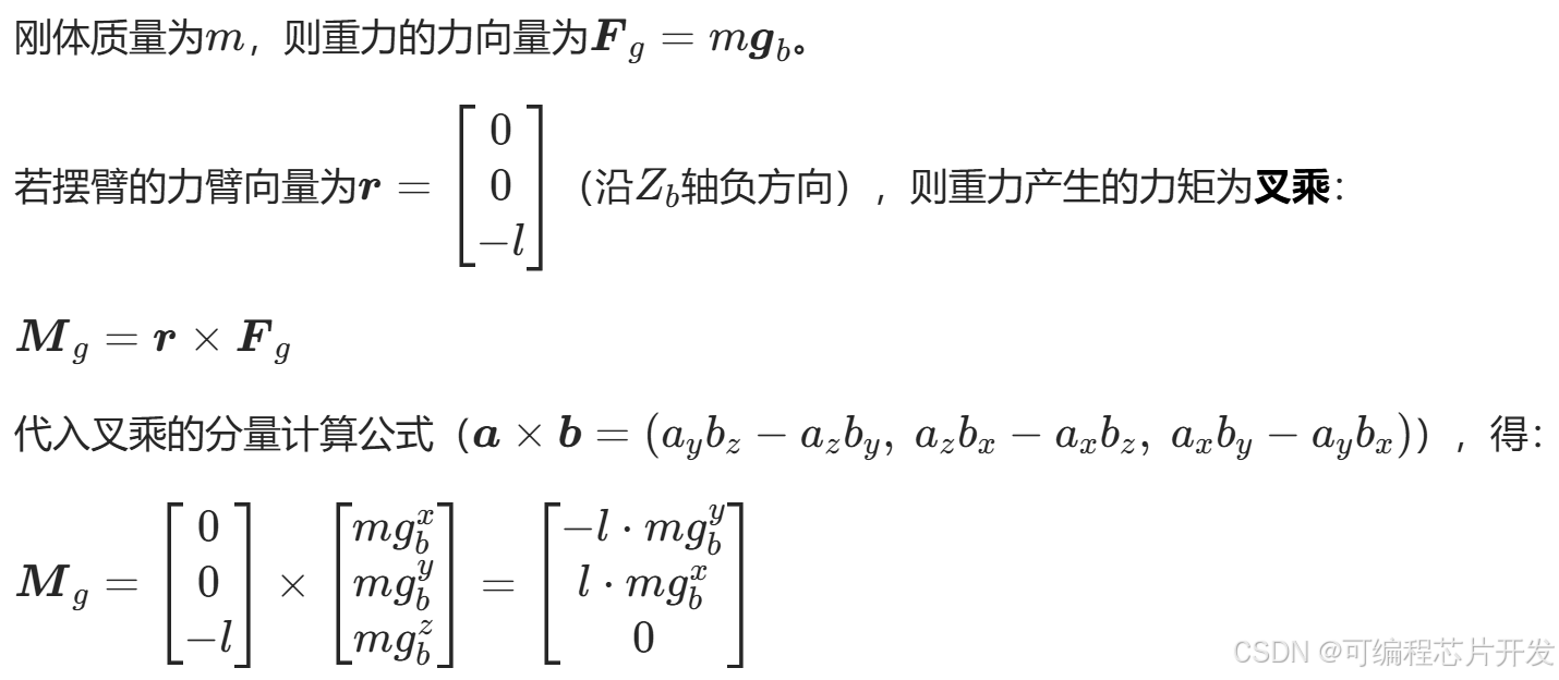 重力在惯性系中通常沿Ze轴负方向,需转换为体坐标系的分量,才能参与体坐标系的力矩计算。