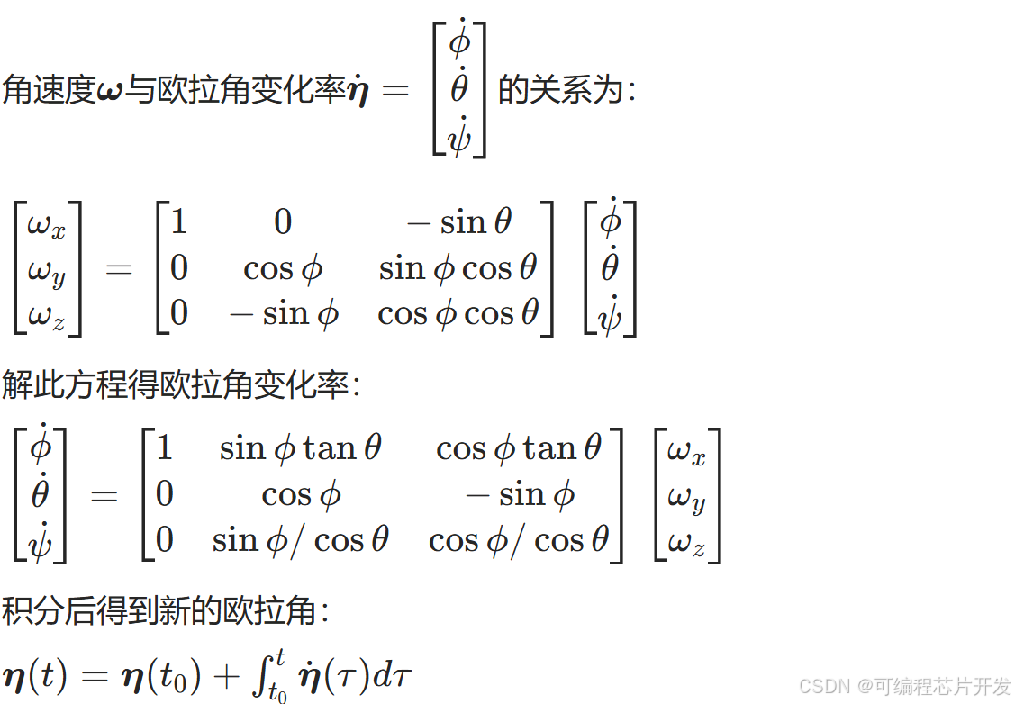 角加速度积分得到角速度,角速度通过欧拉角的微分关系更新姿态。