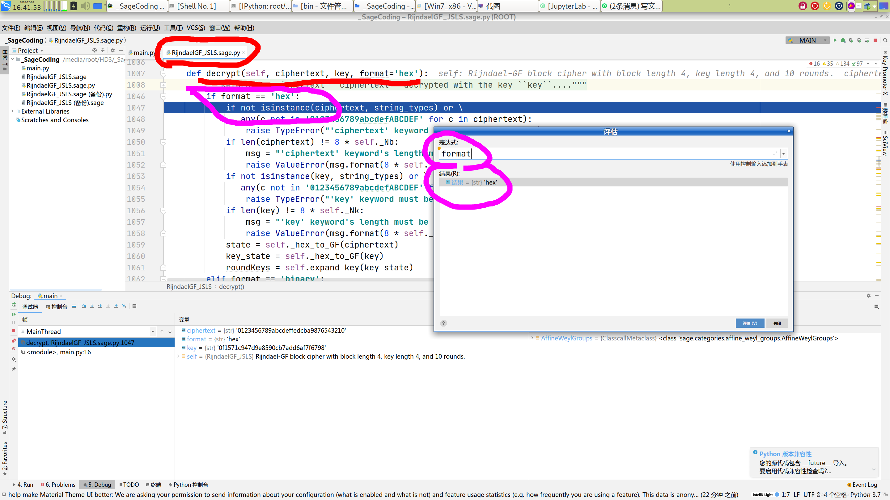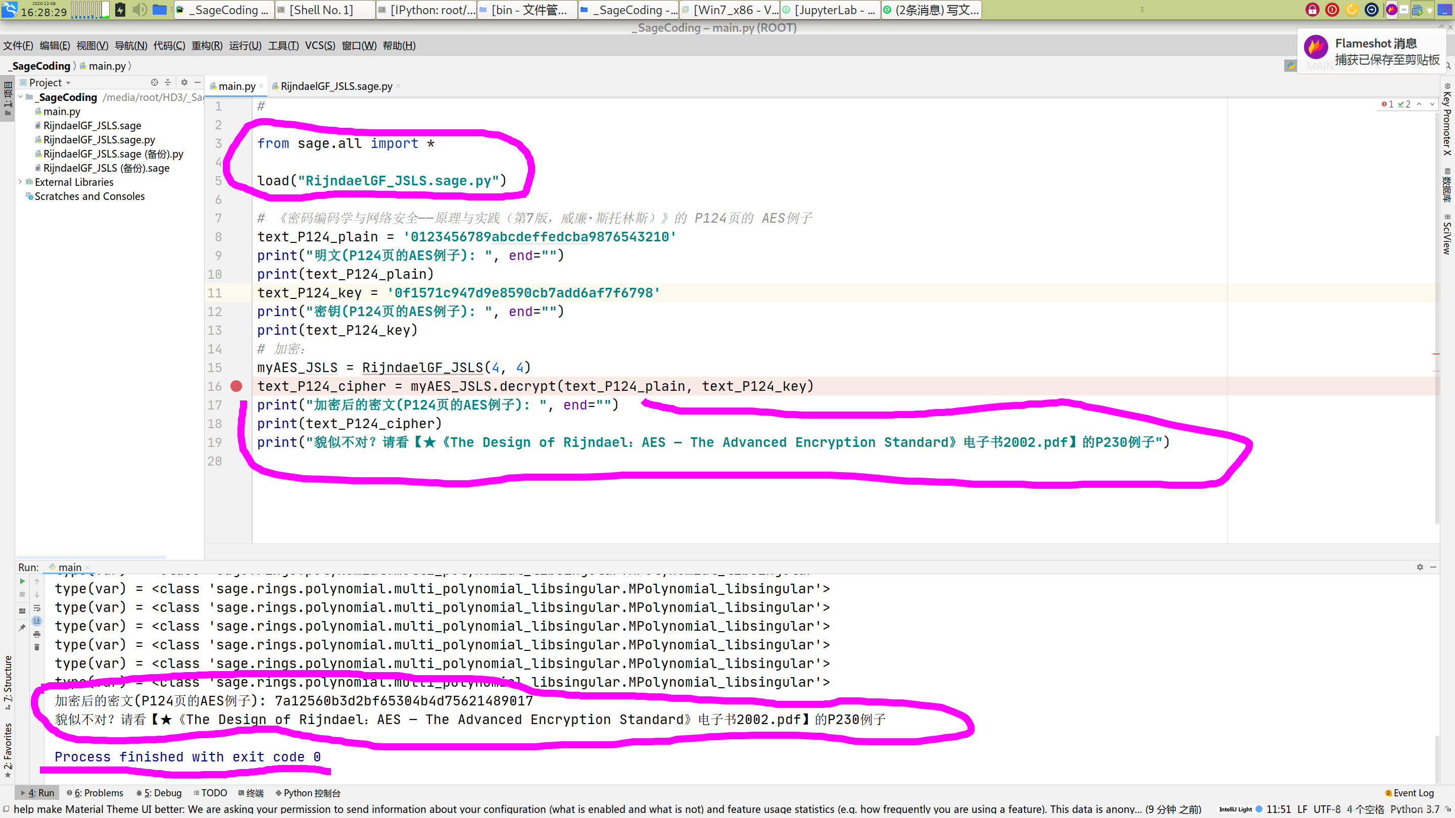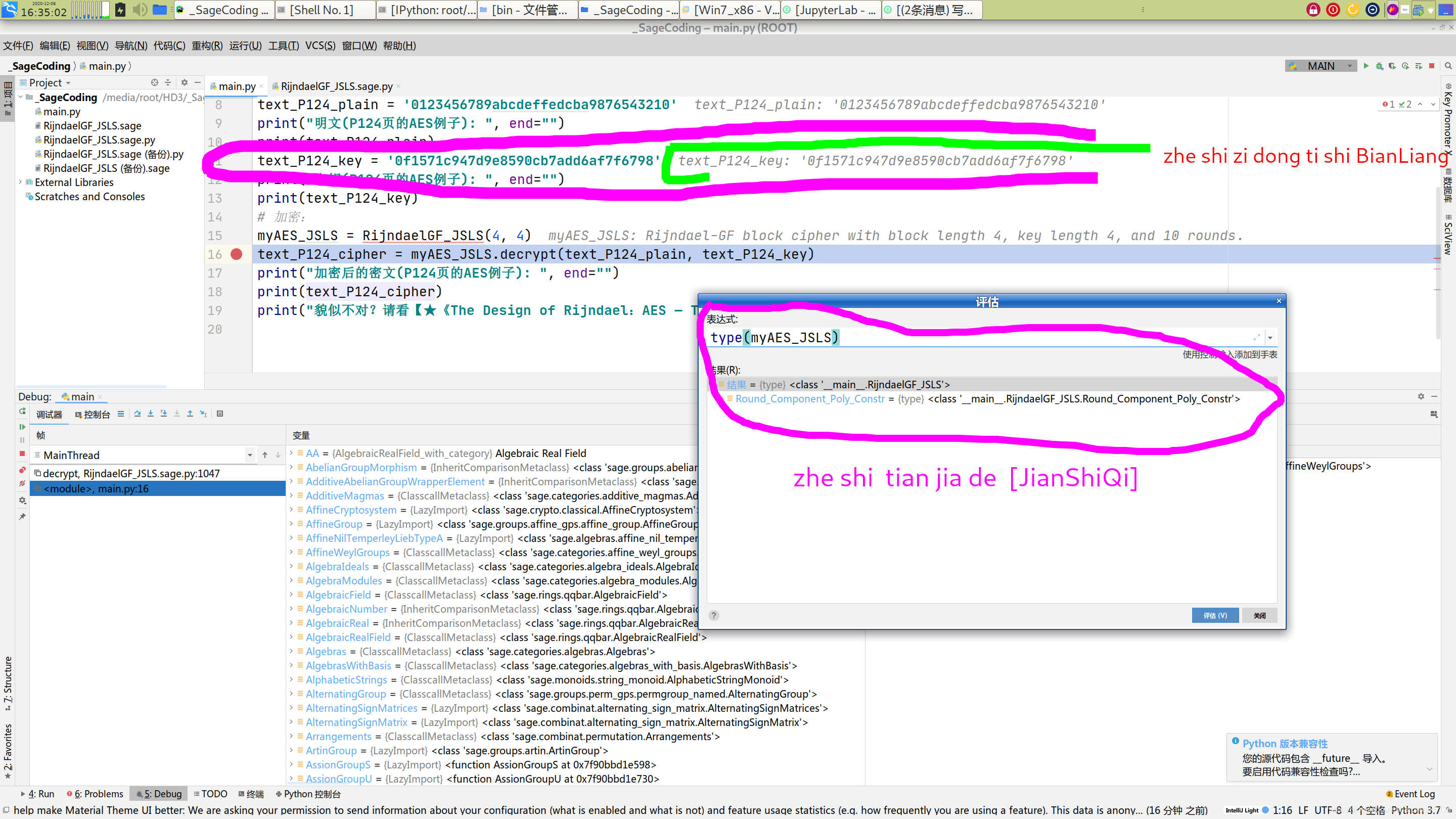 ②新建项目,两个文件: main.py 和 正在调试修改的 RijindaelGF_JSLS.sage.py 。