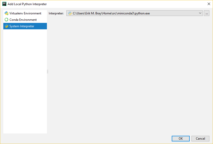 如果您没有Path正确设置环境变量,那么您将在此处收到错误消息(它可能显示“权限错误”或类似的内容)。这是因为Windows使用Path环境变量来搜索DLL,并且需要添加正确的路径才能找到Cygwin DLL。否则,解释器可执行文件甚至无法启动。如果发生这种情况,您仍然可以继续添加该解释器,但是只有设置了必要的环境变量后,该解释器才起作用。
