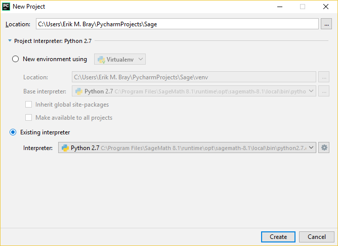 然后,当您开始一个新项目时,请确保选择Sage Python作为默认解释器(您也可以将它与virtualenv一起使用,但我没有尝试过-如果您确保它继承了系统站点-packages,否则您就无法获得Sage等。)一般而言,我认为没有必要: