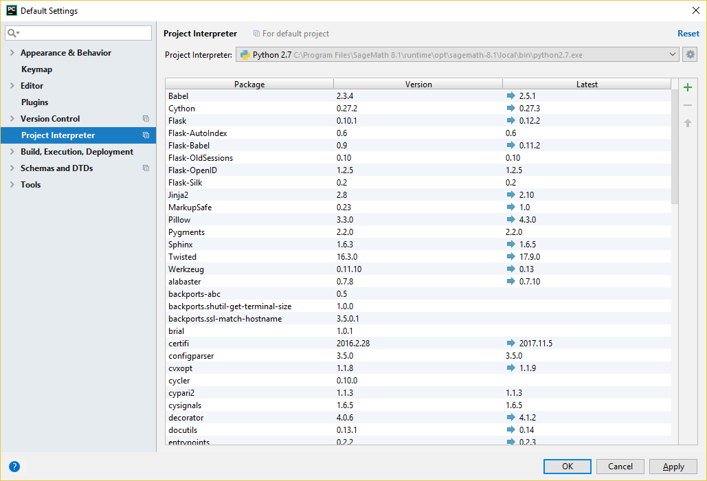 如果您设置了正确的环境变量,PyCharm应该能够成功执行Sage的Python解释器,并填充为该解释器安装的软件包列表,您将看到类似以下的内容: