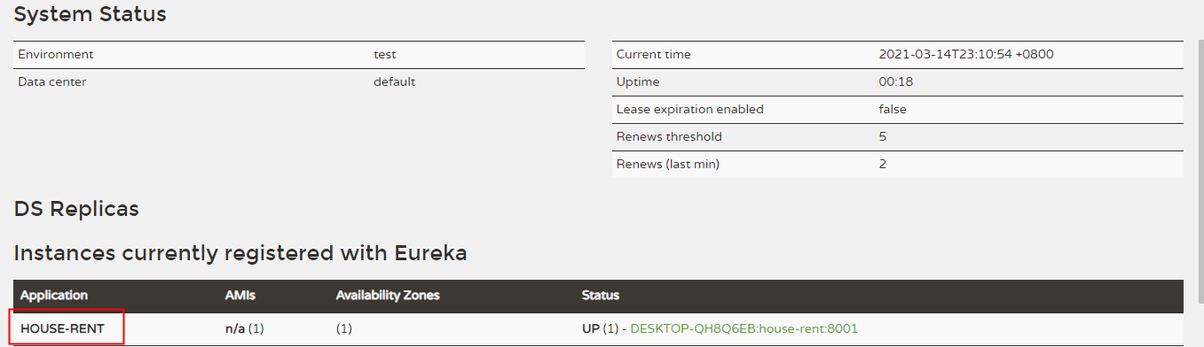 可以看到出租房屋微服务已经注册到了中介(注册中心)。接下来我们就可以从中介(注册中心)这里获取房源来挑选自己合适的小窝了。