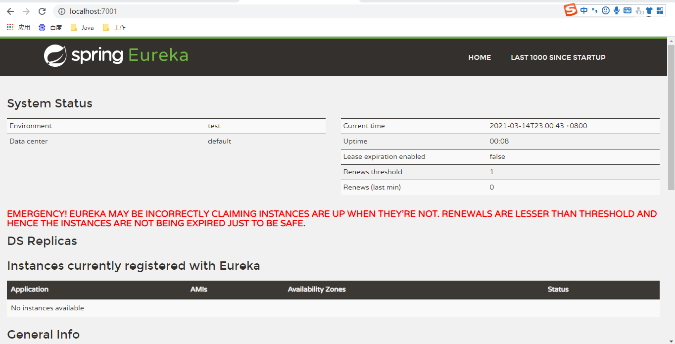 小总结下:改pom文件加入eureka-server依赖,写application.yml,主启动类添加@EnableEurekaServer #开启Eureka支持。运行主启动类即可得到: