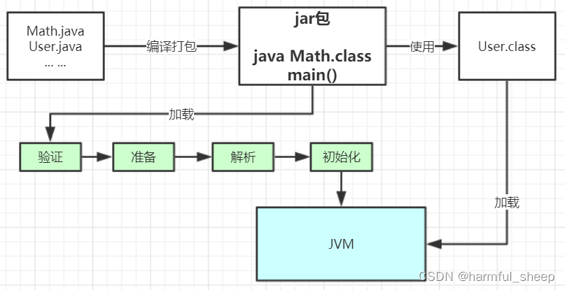 - 加载:在硬盘上查找并通过IO读入字节码文件,使用到类时才会加载,例如调用类的main()方法,new对象等等,在加载阶段会在内存中生成一个代表这个类的java.lang.Class对象,作为方法区这个类的各种数据的访问入口
