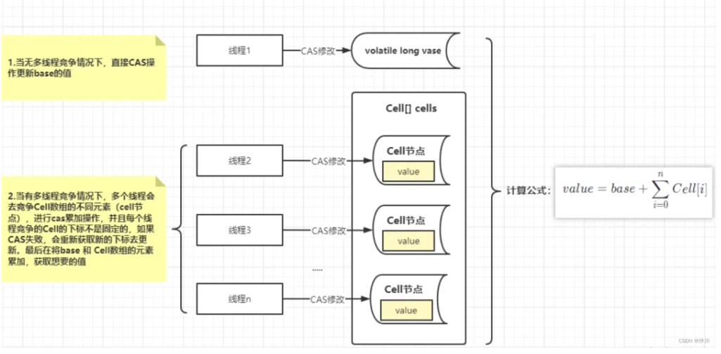 在高并发时,只有一个线程是执行成功的,其他的线程都会失败,不断自旋(重试),自旋会成为瓶颈。而 LongAdder 的思想就是把要操作的目标资源 分散,到数组 Cell 中。每个线程对自己的 Cell 变量的 value 进行原子操作,大大降低了失败的次数。