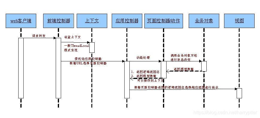 即,前端控制器+应用控制器+页面控制器(也有称其为动作)+上下文,也是Web MVC,只是责任更加明确,详情请参考《核心J2EE设计模式》和《企业应用架构模式》如图1-10: