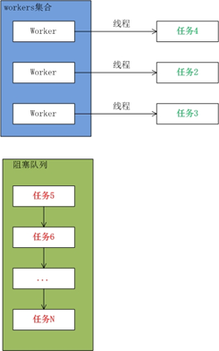 当workers集合中处理完某一个任务之后,会从阻塞队列中取出一个任务来继续执行,如图2所示。图2表示"任务1"处理完毕之后,线程池将"任务4"从阻塞队列中取出,放到workers中进行处理。