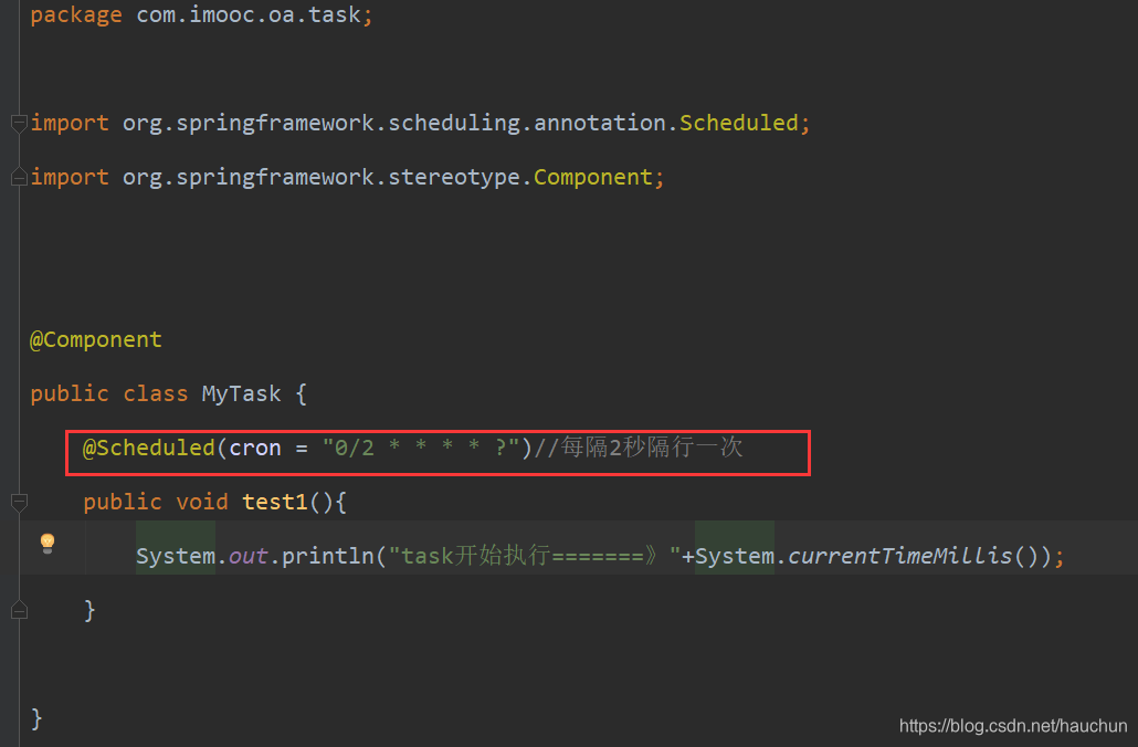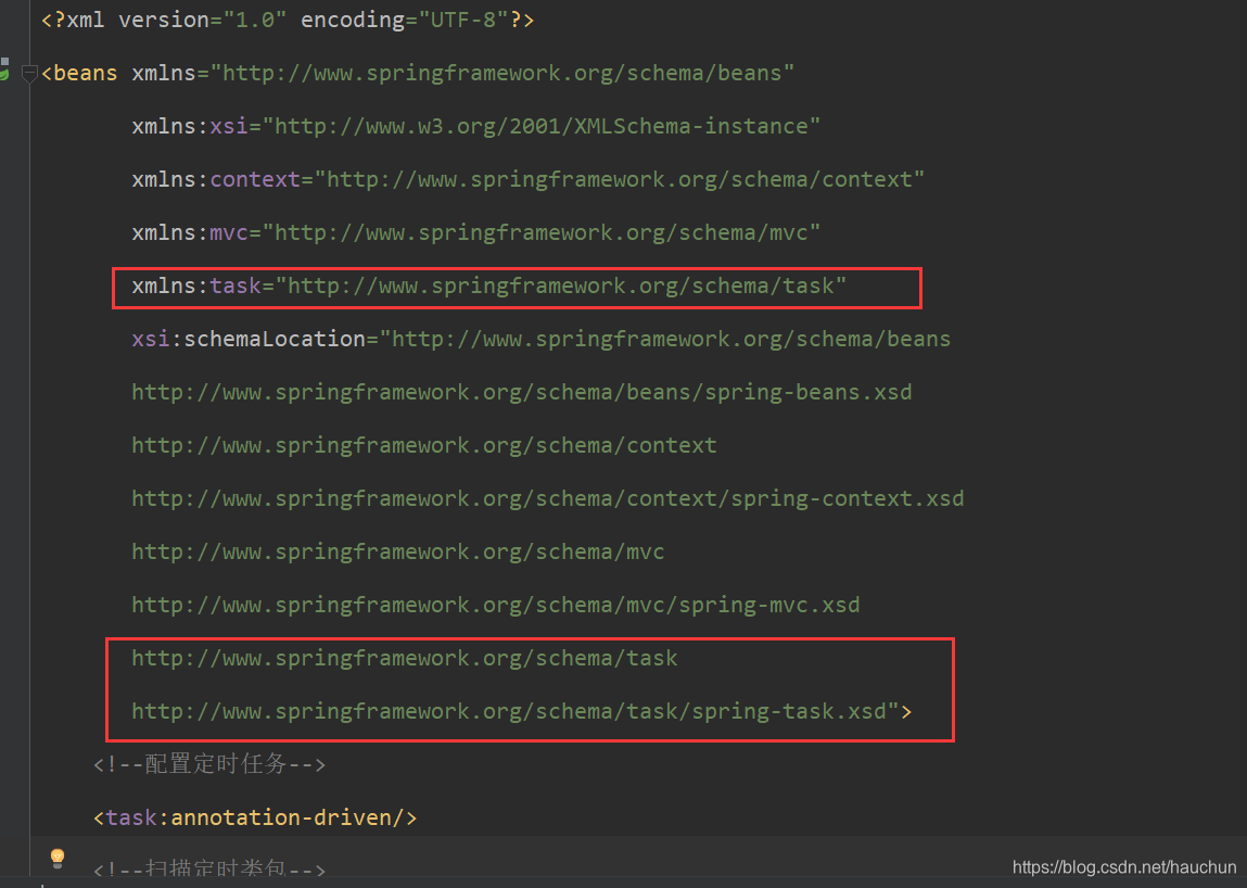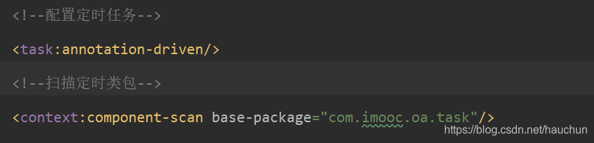 然后开启定时器的扫描,并且把包扫描也打开,因为在定时器类里面用到了Spring的注解,不打开相应的包扫描是扫描不到的
