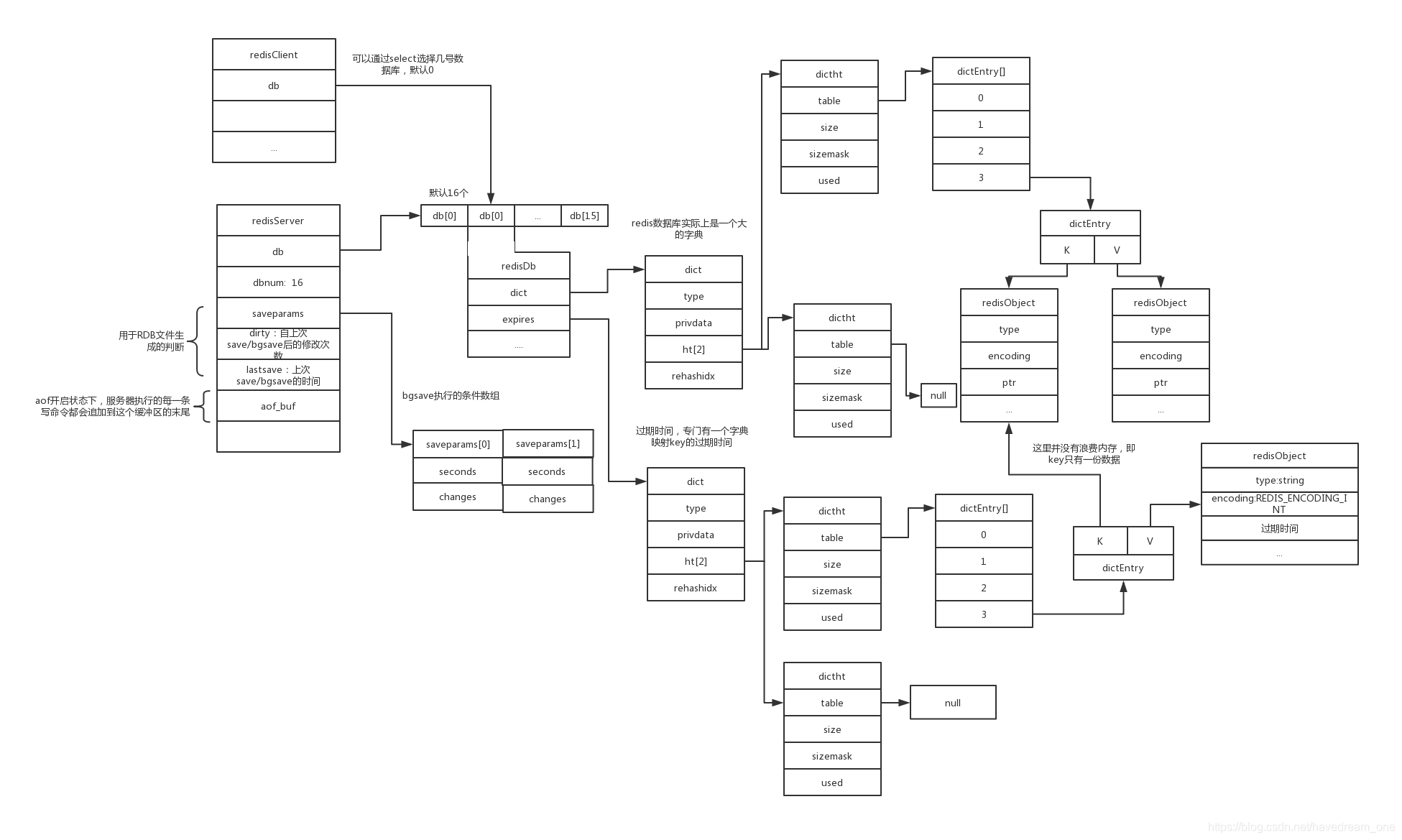 3.4.2、结构: 字典维护了两个hash表ht[0]、ht[1],类似于jvm的s0、s1,其中ht[1]会在rehash的时候使用
