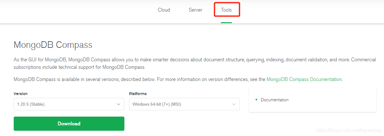 选Tools下载:mongodb-compass-1.20.5-win32-x64.msi,MongoDB Compass 是一个图形界面管理工具