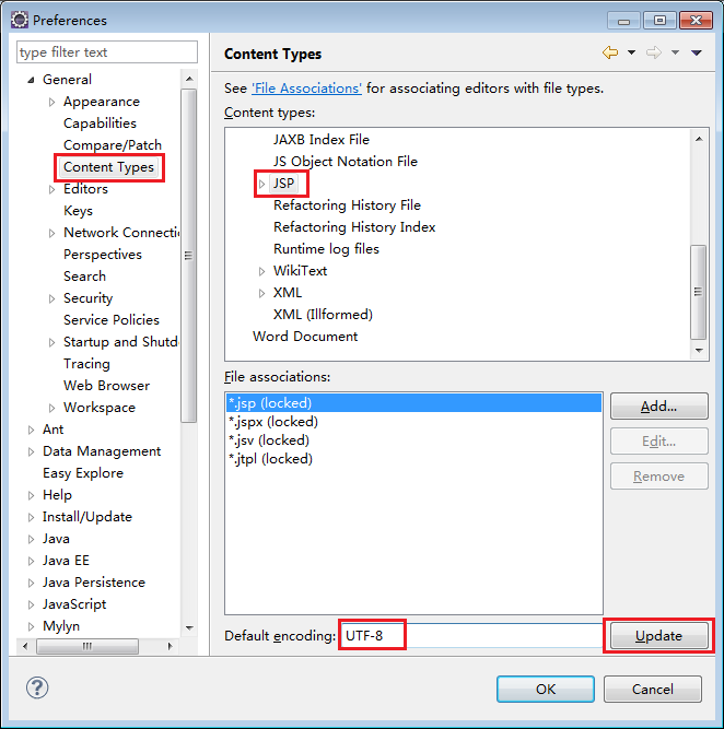 eclipse 的window-->prefrences -->general -->content type中可以设置不同文件格式的编码