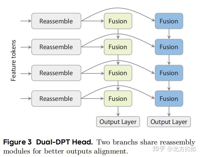 - 双分支DPT解码头 (Dual-DPT Head):为了从Transformer提取的特征中同时预测深度图和光线图,DA3设计了一个新颖的解码头。该解码头首先通过一组共享的模块处理特征,然后分为两个分支,分别用不同的融合层来生成最终的深度图和光线图。这种设计鼓励两个任务之间进行强交互,同时避免了中间表示的冗余。