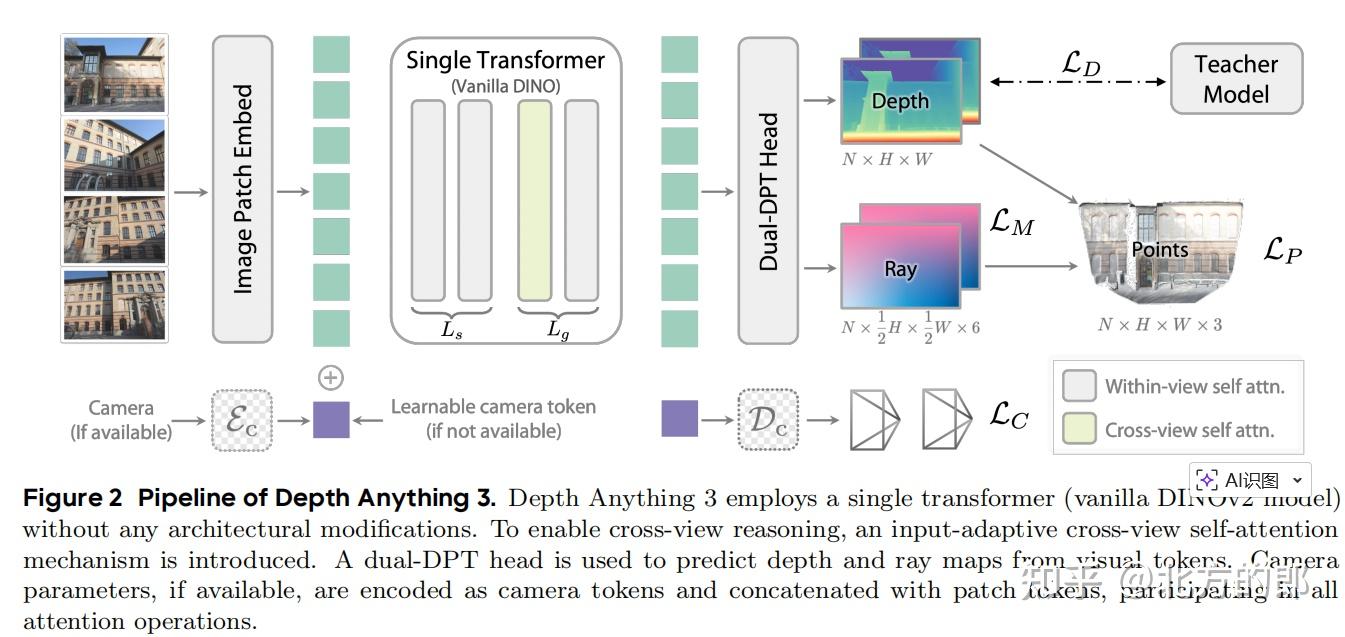 DA3对这两个问题给出了肯定的答案。它创新地提出了一种**“深度-光线”(depth-ray)**的表示方法作为其唯一的预测目标,并证明了仅使用一个标准的视觉Transformer(ViT)作为骨干网络就足以实现最先进的性能。