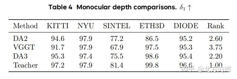 - 单目深度精度:如表4所示,在标准的单目深度估计基准上,DA3的表现优于其前身DA2和强劲对手VGGT。其教师模型DA3-Teacher更是达到了接近完美的性能。