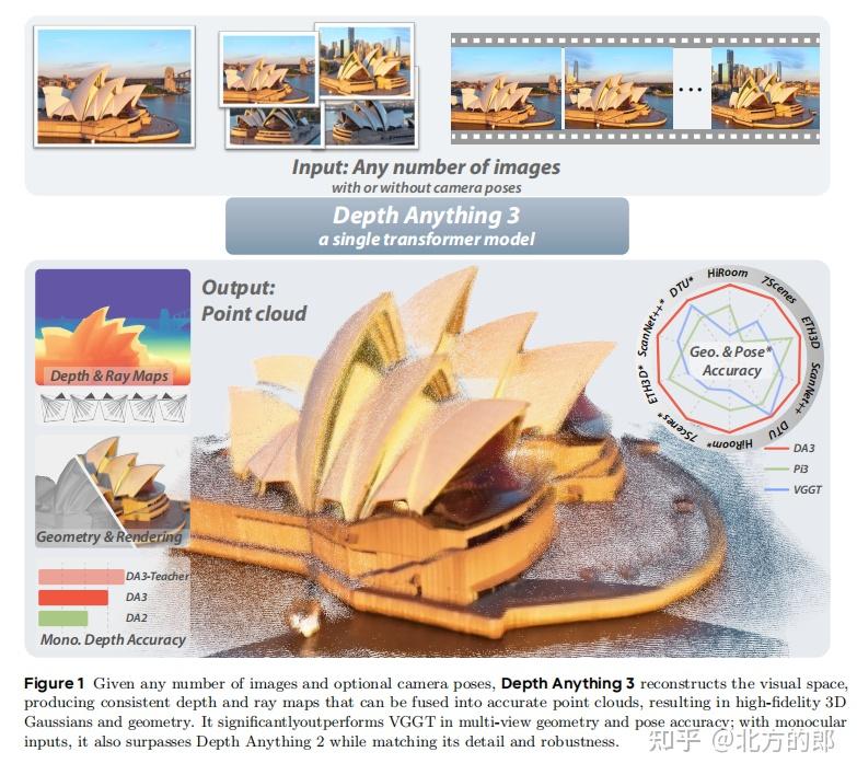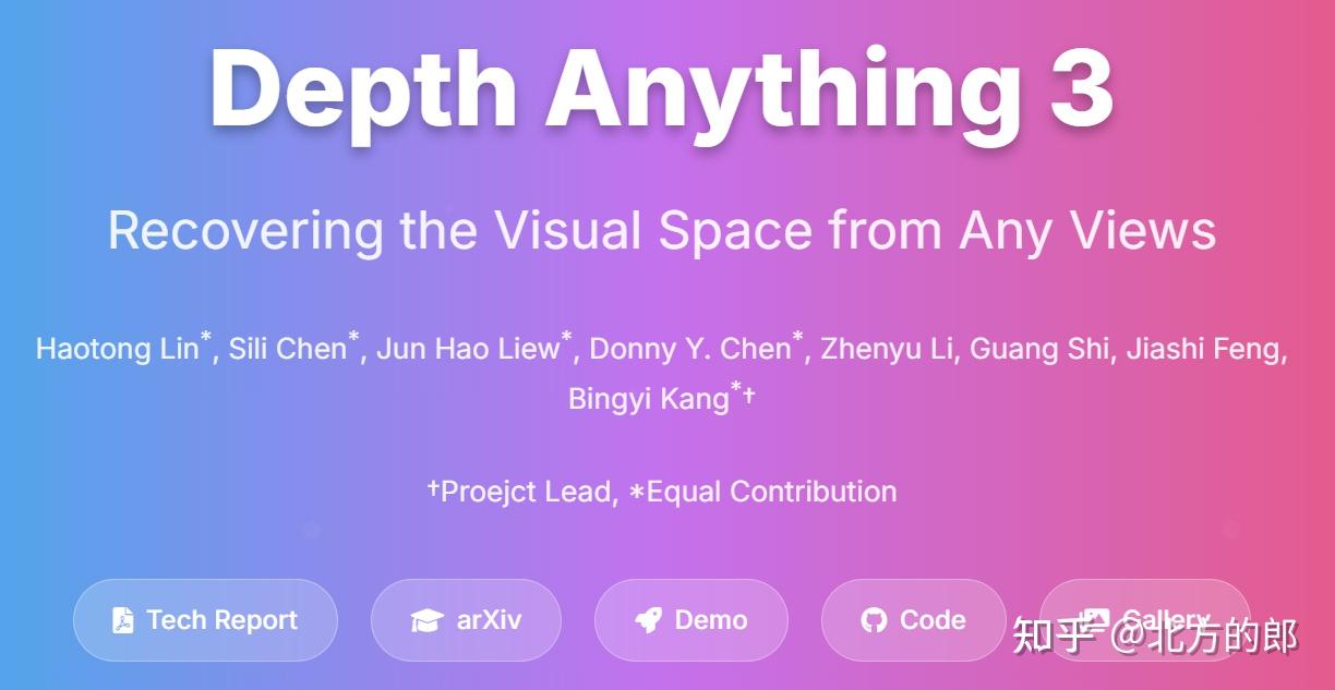 面对这一挑战,来自字节跳动(ByteDance Seed)的研究团队提出了一个颠覆性的解决方案——Depth Anything 3 (DA3)。这篇于2025年11月13日发布的论文,旨在打破3D视觉任务之间的壁垒,实现一个“大一统”的视觉几何模型。DA3的核心思想是“化繁为简”,它以一个惊人简洁的架构,实现了从任意数量、任意视角的图像中恢复三维空间几何的能力,无论是否提供相机位姿。这不仅是一次技术的迭代,更是对3D视觉感知范式的一次深刻重塑,标志着我们向通用3D感知迈出了里程碑式的一步。