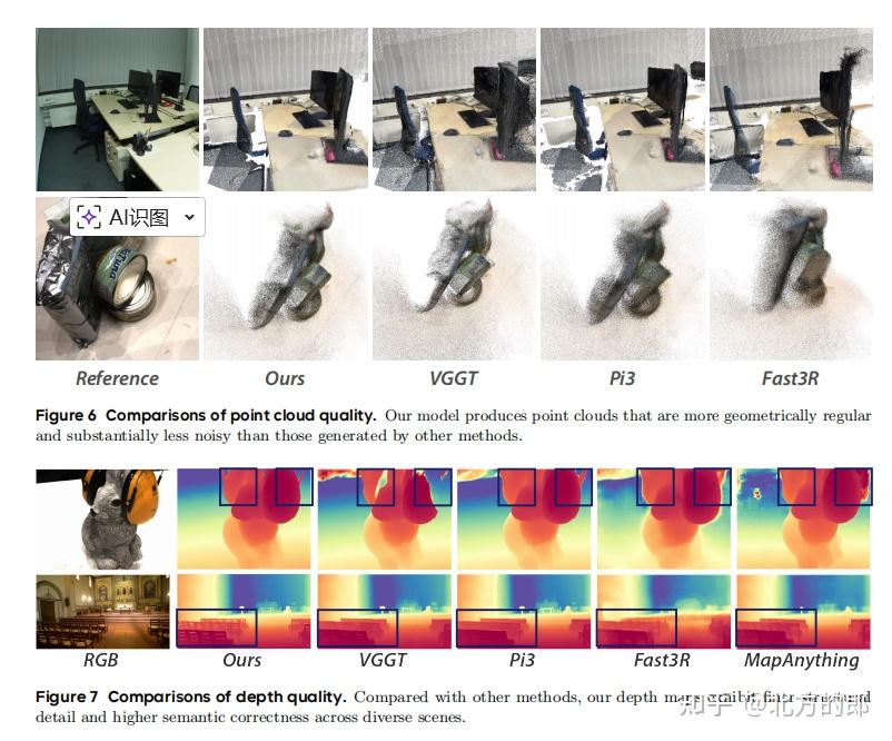 定性结果(图6、图7)同样令人印象深刻,DA3生成的深度图细节更丰富、语义更准确,重建的点云也更规整、噪声更少。