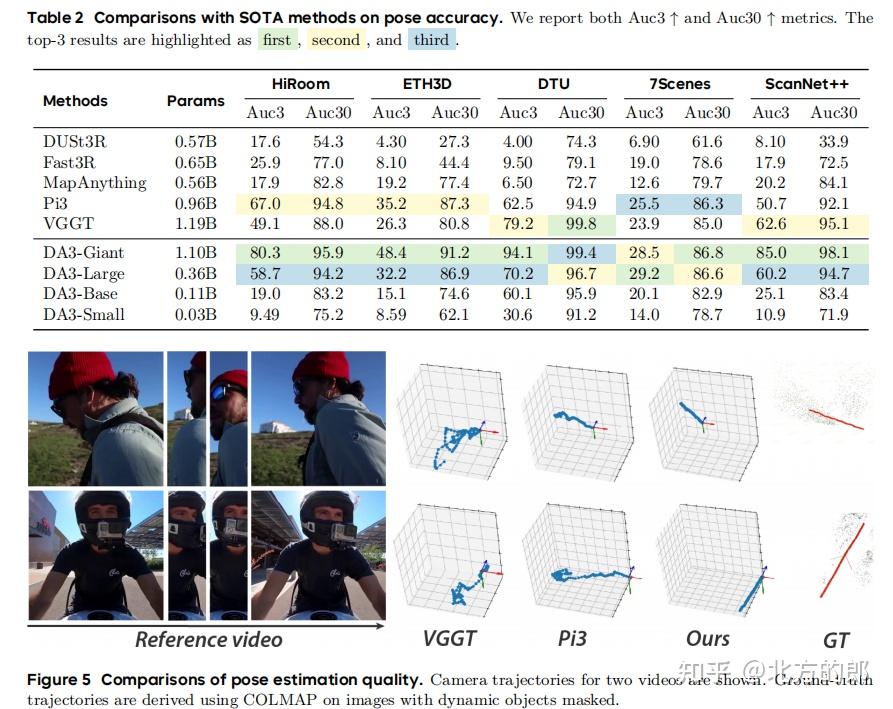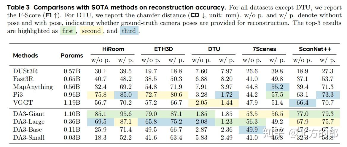 特别值得一提的是,他们还提出了一个位姿自适应 (Pose-Adaptive) 版本,该版本与DA3使用完全相同的预训练权重,能够无缝处理带位姿和不带位姿的输入,极大增强了模型的实用性。