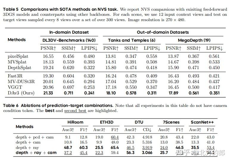 - 新视角合成:如表5所示,以DA3为骨干的NVS模型在所有数据集上均优于其他方法,证明了强大的几何理解能力对渲染质量的直接助益。