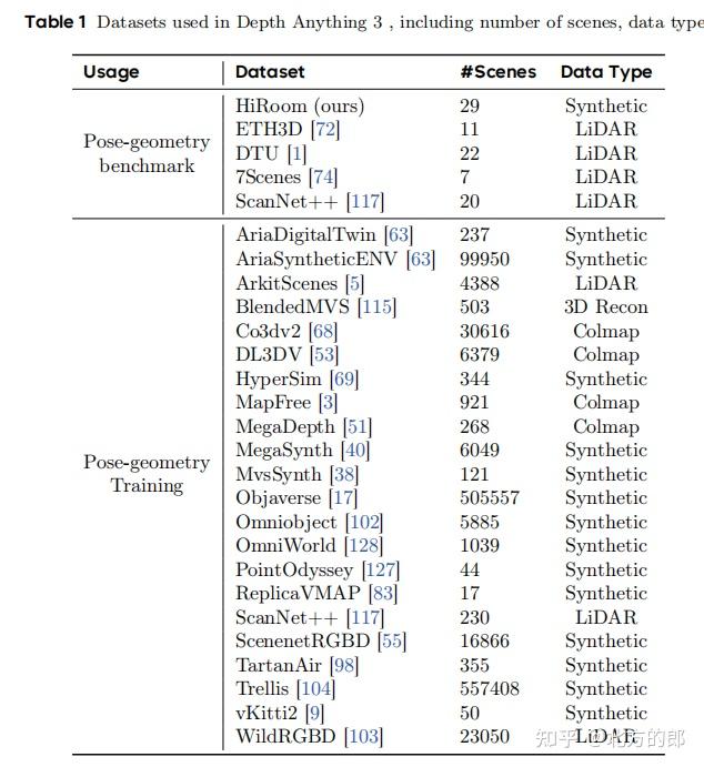 - 数据规模扩展:相比DA2,DA3的教师模型使用了更多样化的合成数据集,涵盖室内、室外、以物体为中心等多种场景,显著提升了模型的泛化能力。