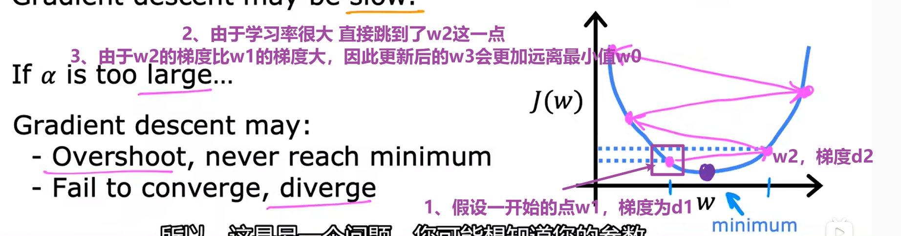 终可能会永远无法达到最小值,或者发散。