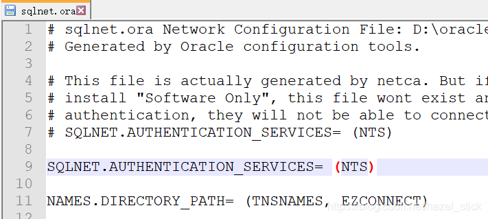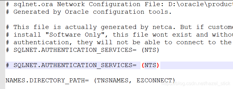在Oracle中可以通过修改sqlnet.ora来修改登录方式。sqlnet.ora的地址为:Oracle安装地址文件夹+oracle\product\10.2.0\db_1\NETWORK\ADMIN,例如 C:\oracle\product\10.2.0\db_1\NETWORK\ADMIN。用记事本或者其他的文本编辑器打开。查看SQLNET.AUTHENTICATION_SERVICES= (NTS)是否存在。如下图。