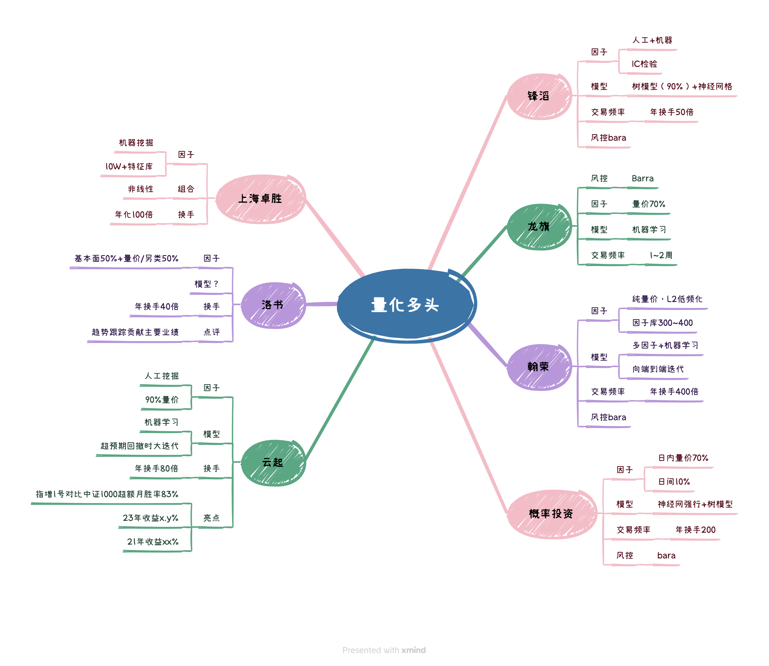 在量化多头策略归类中,因子来源主要是人工挖掘,主打一个可解释性。量价类因子仍然占据主流,也是策略收益的主要贡献者。因子数量一般在几百,但也有个别主打机器挖掘的,因子库就比较大,比如上海卓胜,就搞了一个10W+的特征库。