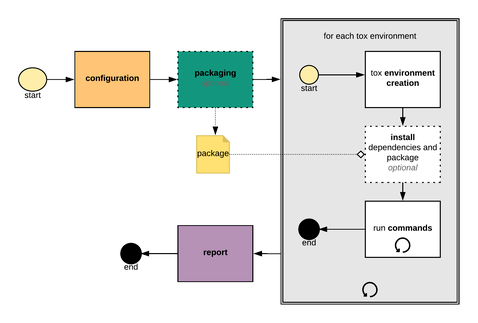 根据这张图,tox 读取配置文件,打包待测试软件,按照配置文件创建虚拟环境,并安装待测试软件和依赖,然后依次执行测试命令。最终,当所有虚拟环境下的测试都通过后,tox 会生成测试报告。