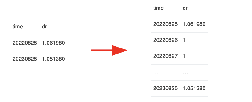 第一步的运算实际上是一个join运算。我们使用一个在交易日上连续的空的dataframe与上述dd[‘dr’]进行join,其结果就是,如果记录在dd[‘dr’]中存在,就使用dd[‘dr’]中的数值,如果不存在,就使用空值。