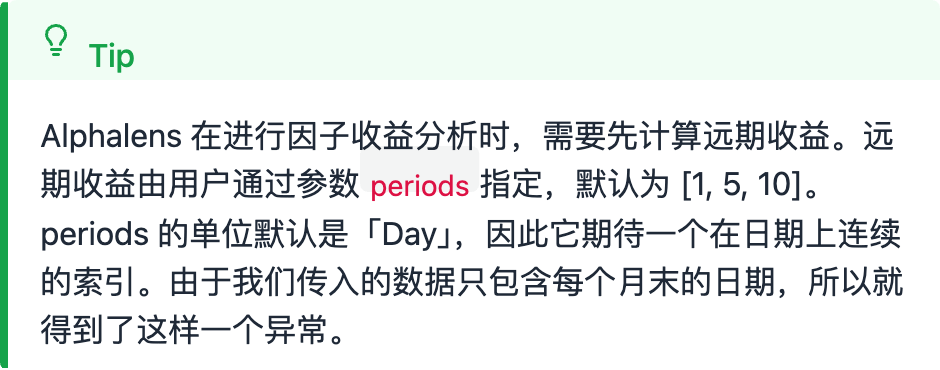 从根本上说,Alphalens 无法处理按月调仓的策略。Alphalens 推荐的一个变通方案是,你可以按日计算因子,再指定periods参数为 [21, 105, 210],这样来模拟按 1 个月、5 个月和 10 个月来计算远期收益。但是,它推荐的变通方案也不见得可行,因为不是每个月都刚好 21 个交易日。