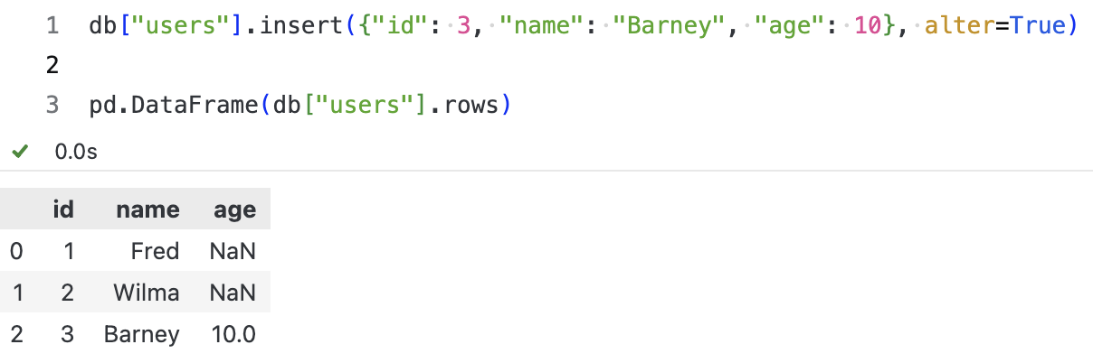 db["users"].insert_all([{"id": 1, "name": "Fred"}, {"id": 2, "name": "Wilma"}]) # ❷