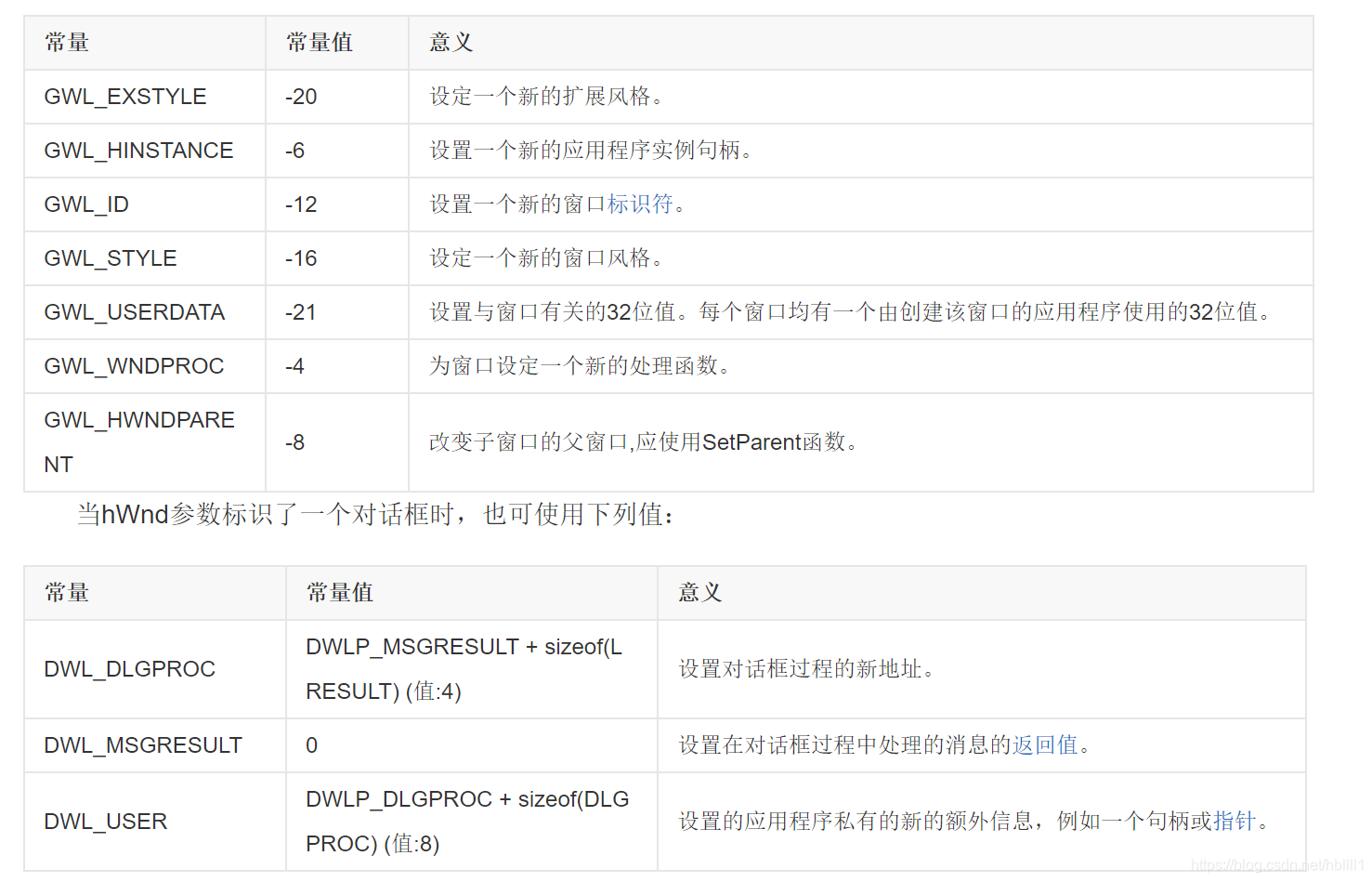 MSDN上的解释:https://docs.microsoft.com/en-us/windows/win32/api/winuser/nf-winuser-setwindowlonga