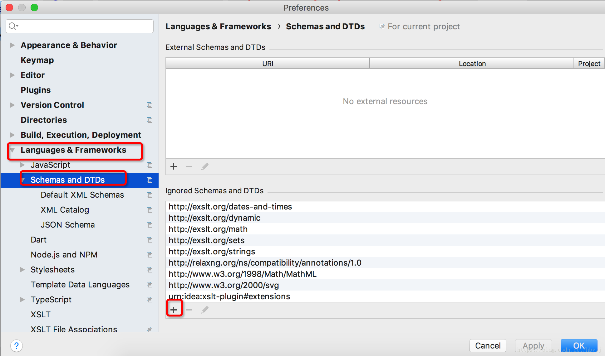 虽然是报错了, 但是IDE还是很友好的给出了解决方案,告诉了我们去哪里解决,还是提示中的信息:settings | languages & frameworks | schemas and dtds,我们就根据这个提示去找就行了。