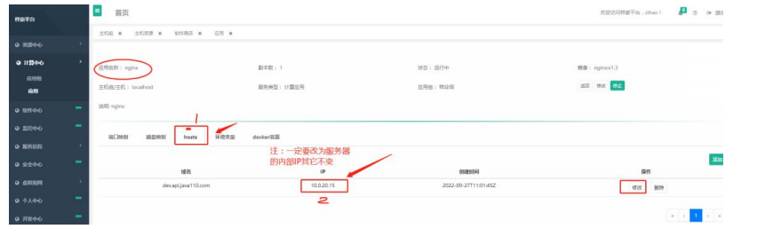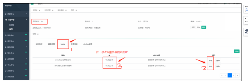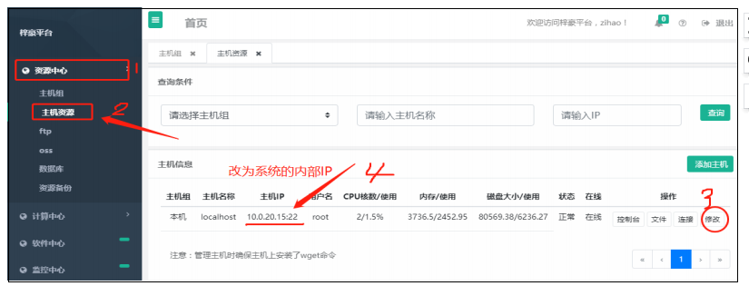 在梓豪平台系统资源中心,主机资源里面进去修改服务器 IP(一定要改为内部