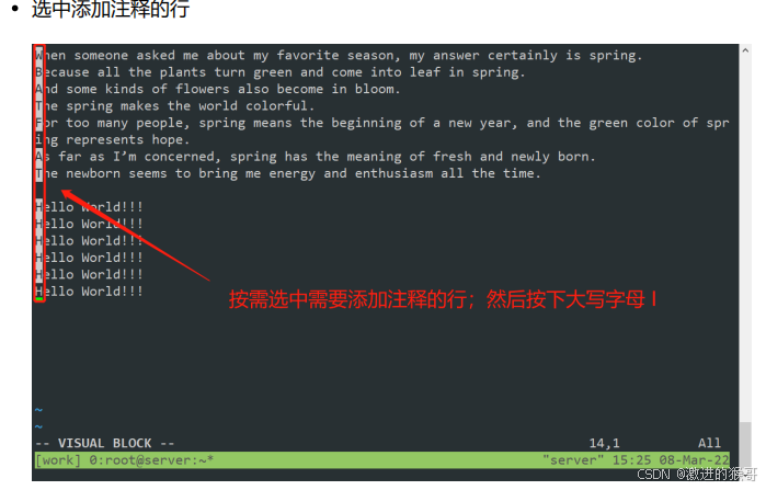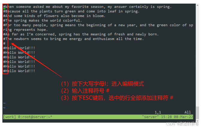 按下大写的字母 I 键,进入编辑模式输入注释符 #