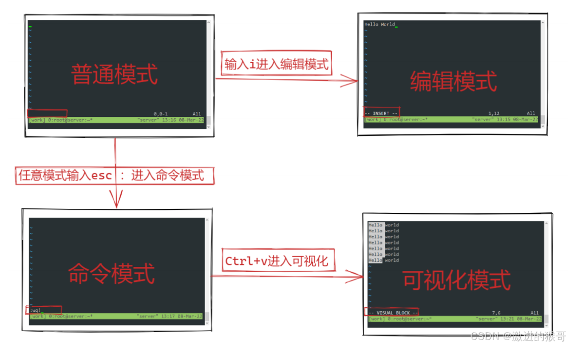 普通模式 (Normal-mode)编辑模式 (Insert-mode)命令模式 (Command-mode)可视模式 (Visual-mode)