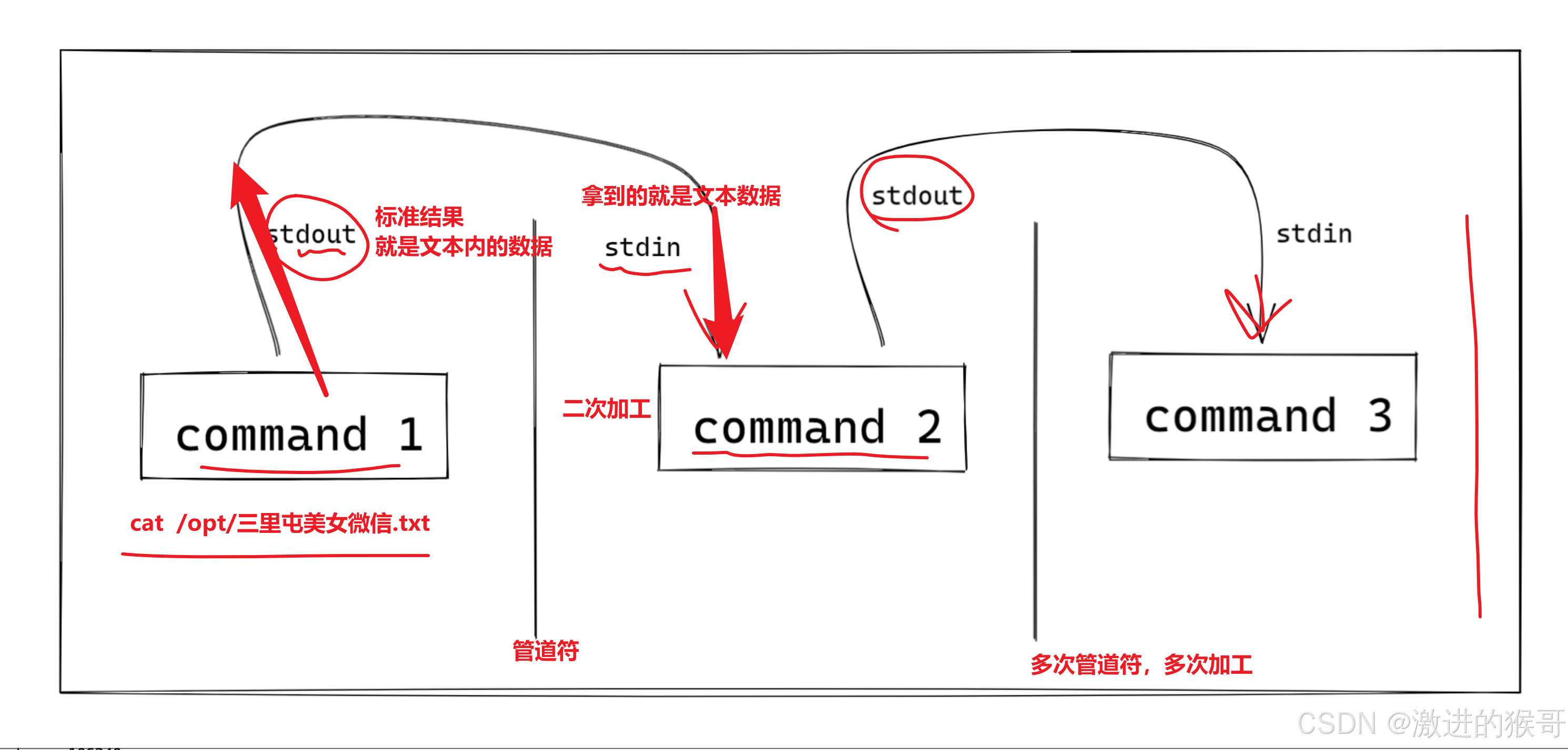 它表现出来的形式将==前面每一个进程的输出(stdout)直接作为下一个进程的输入(stdin)==。