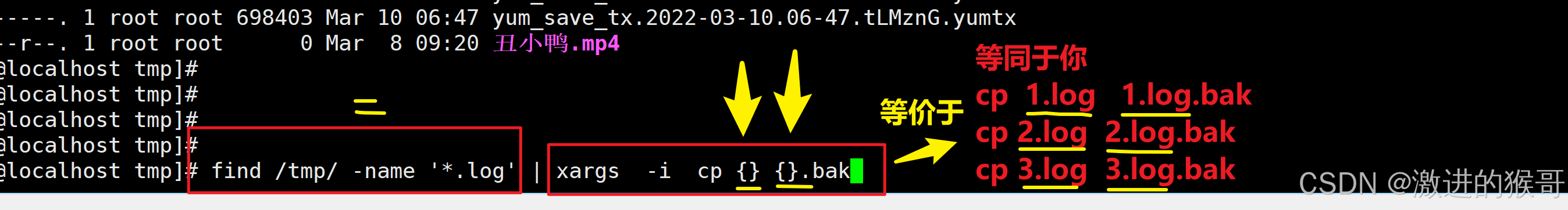 [root@server ~]#find /var/log/ -type f -name "*.log" | xargs -i cp {} /var/log/bak_log/
