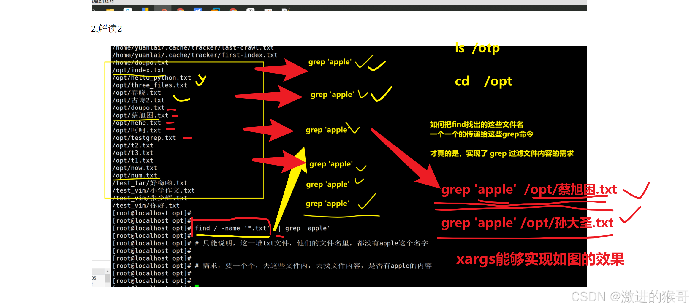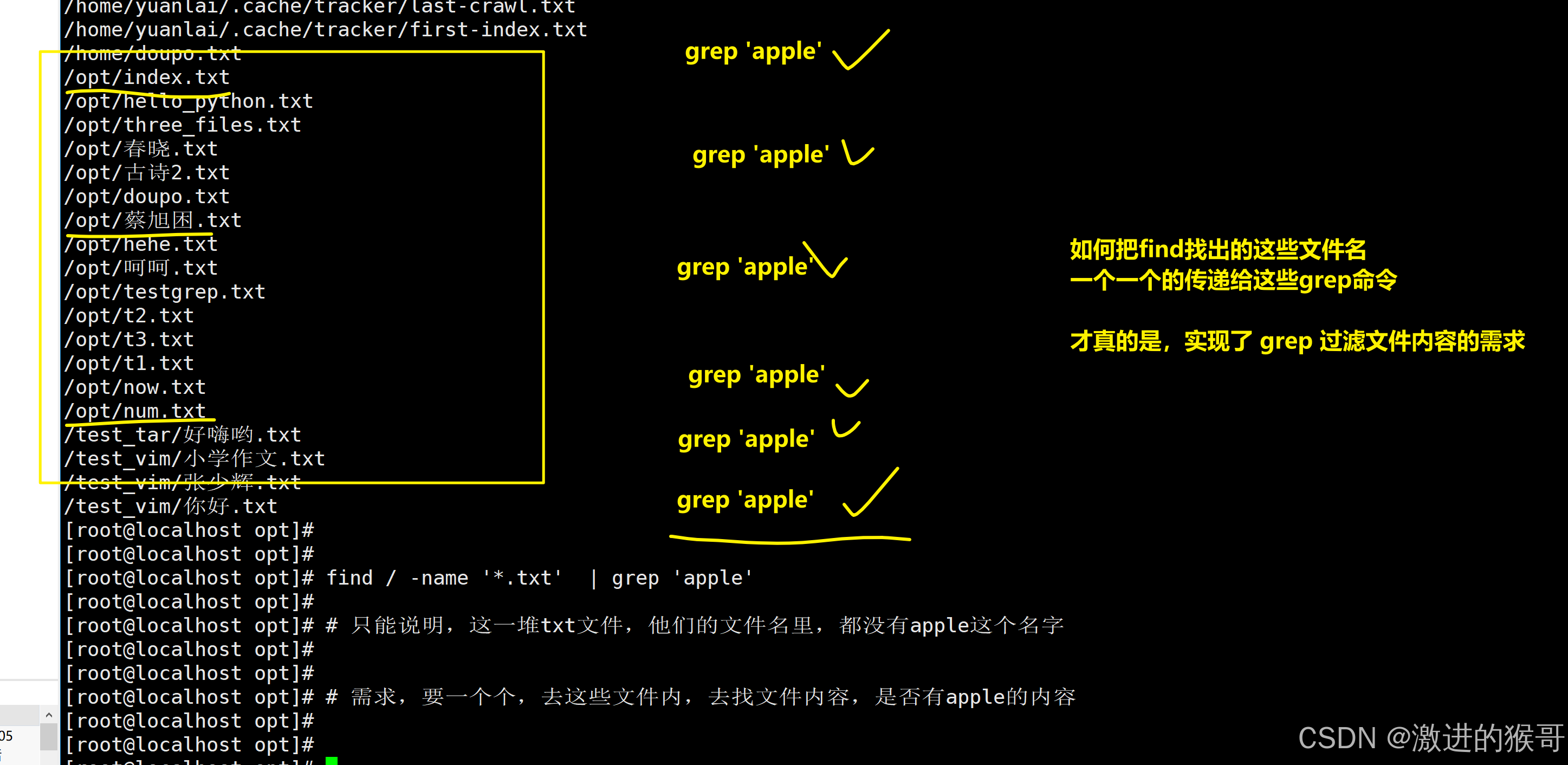 find / -name '*.txt' # 这个命令找出的,每一个txt文件的名字吧,并且就是,一堆,一行一行的文本而已2.我要判断出,这些文件,哪一个是包含了apple字符串内容的