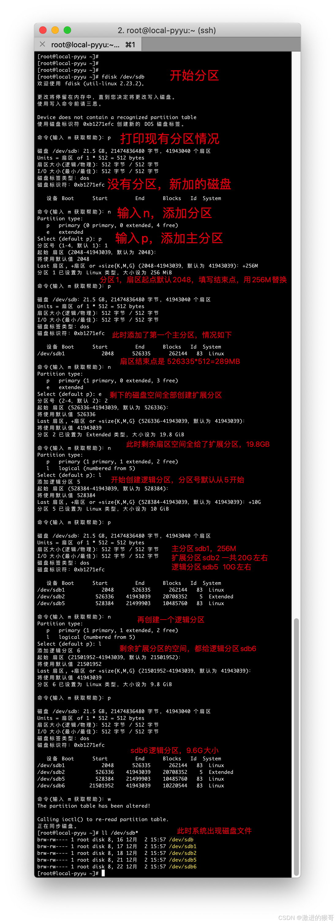 1.执行fdisk /dev/sdb命令,给硬盘创建分区/dev/sdb1、/dev/sdb2、
