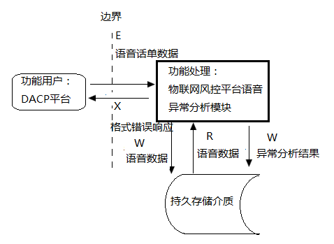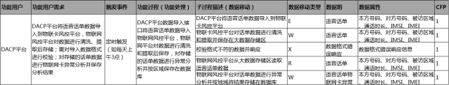 - 功能过程识别为:DACP平台数据导入接口将语音话单数据导入物联网风控平台,物联网平台对数据进行清洗和提取后保存,对存储的话单数据进行异常分析并按区域保存在数据库;