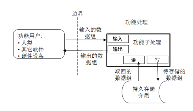 功能处理是最小的,独立的功能部件,每个功能需求都可以拆分为功能处理,如人员管理功能拆分为增加一个人员,删除一个人员等。一个功能处理至少包含两个数据移动,一个输入E加上一个输出X或写W。
