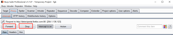forward: 进行请求后被拦截,点击forward可以继续此次请求,如果你点击drop则丢弃此请求数据。继续请求后能够看到返回结果