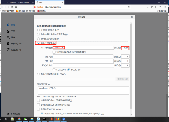 这时候计算机上的火狐浏览器也设置为了代理模式。代理设置成功之后,访问网页是访问不了的,因为我们没有将请求转发,接下来就需要配置burp来转发浏览器的请求。