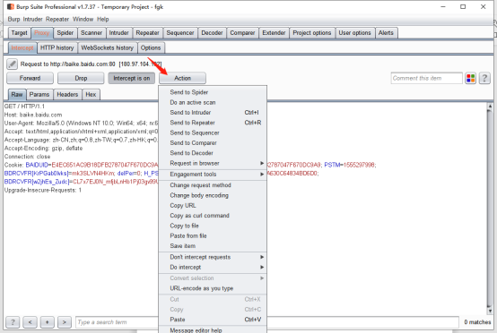 将burp设置为Intercept is on,在火狐浏览器里输入baike.baidu.com