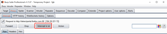 首先看标红,intercept is on 为拦截状态 其对应的intercept is off 为非拦截状态,设置完代理后打开拦截状态,浏览器发起的请求会被burpsuite所拦截