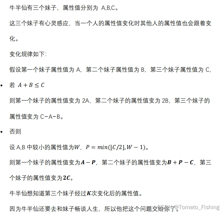 文章讨论了一个关于连续变换后权值计算的问题,通过代码展示了如何使用C++中的整数幂和模运算来求解,得出经过n次变换后特定变量的通项公式。