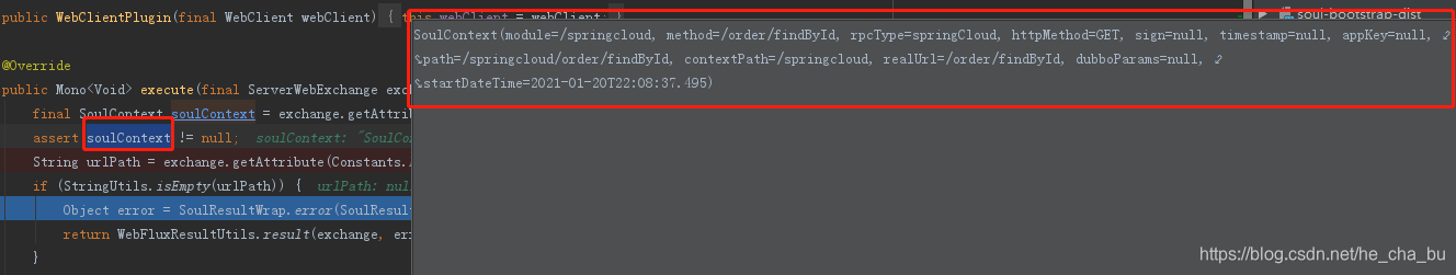 debug进来了,且看soulContext的内容,看起来都是符合预期的,但是urlPath在exchange.getAttribute(Constants.HTTP_URL)的时候获取到的值为null,然后就抛出开头提到的那个异常了。