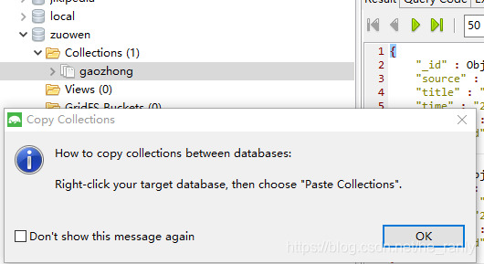 选择一个数据库中的Collections集合,然后按住 Ctrl+C 复制快捷键会弹出如下帮助框。
